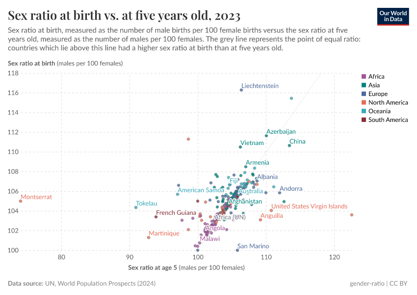 Most countries have a sex ratio at birth around the expected range of 105 boys born for every 100 girls.