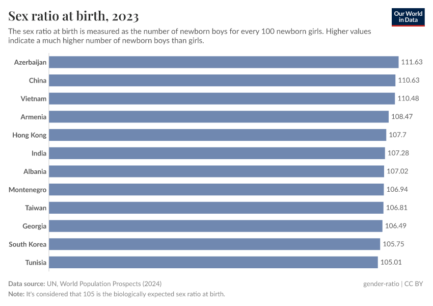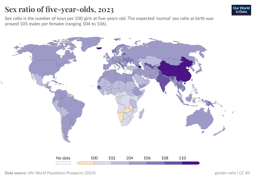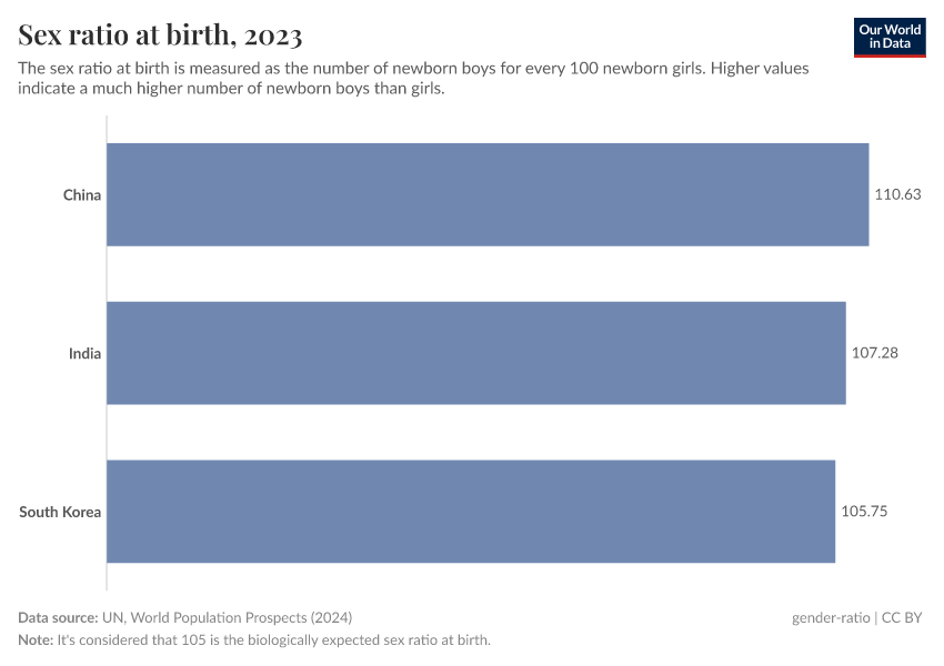 This is what the World Health Organization (WHO) considers the "expected sex ratio at birth”, which means that, in the absence of gender discrimination or interference, it’s expected that there would be around 105 boys born per 100 girls — although this can range from around 103 to 107 boys per 100 girls.