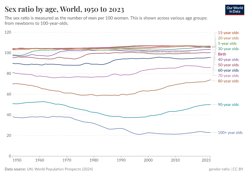 On this page, we provide an overview of how the gender ratio varies across the world and over time. We present data on how it varies between age groups and the forces that influence the gender ratio.