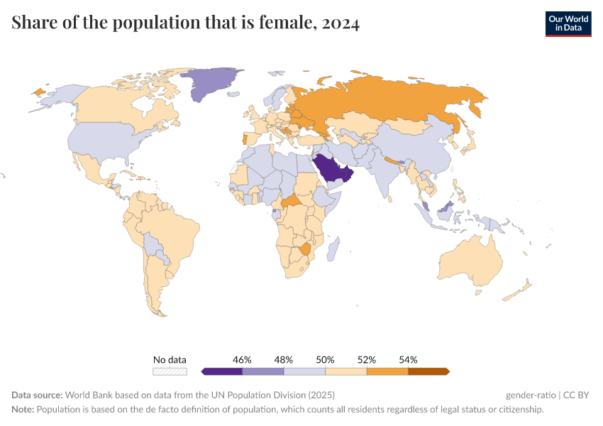 Countries over 50 percent (shown in orange) have a higher female population, while those below 50 percent (shown in purple) have a higher male population.