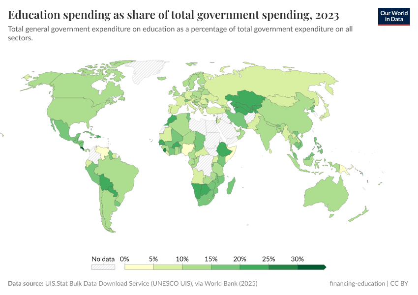 Looking more closely, we can also see variation within specific categories. For example, education spending in some countries is twice or three times higher than in others.
