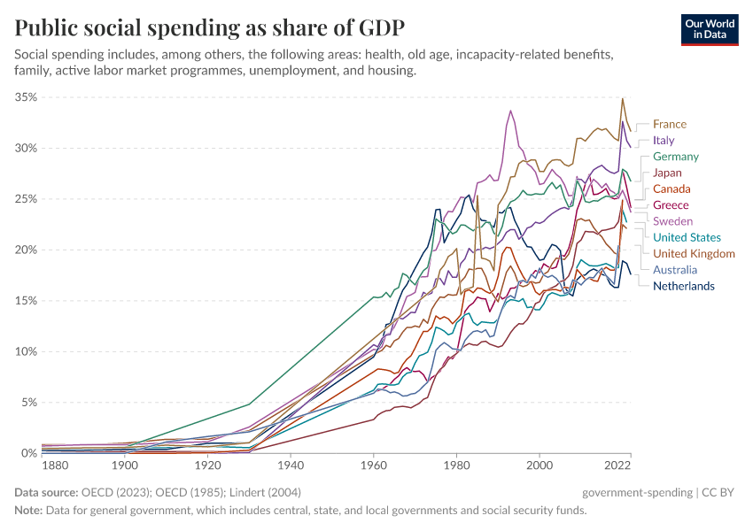 The chart above shows that government spending in early-industrialized countries grew substantially in the 20th century. The next visualization shows that this was the result of growth, specifically in social spending.
