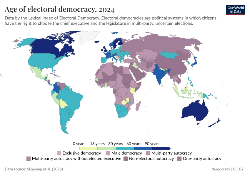 Skaaning et al. (2025) – processed by Our World in Data. “Age of electoral democracy” [dataset]. Skaaning et al., “Lexical Index of Electoral Democracy (LIED) v6.8” [original data]. Retrieved September 5, 2025 from https://data-auxiliary-trade.owid.pages.dev/grapher/age-of-electoral-democracy-lexical