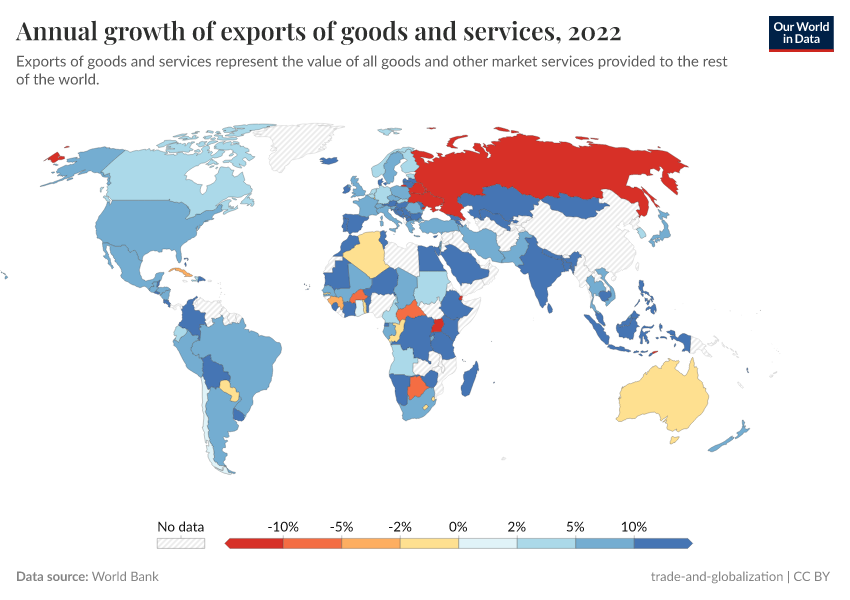 “Data Page: Annual growth of exports of goods and services”. Our World in Data (2025). Data adapted from World Bank. Retrieved from https://data-auxiliary-trade.owid.pages.dev/grapher/annual-growth-of-exports-of-goods-and-services [online resource]How to cite this data