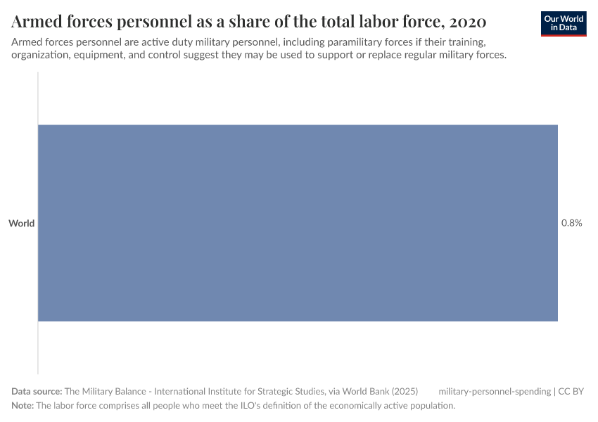 “Data Page: Armed forces personnel as a share of the total labor force”. Our World in Data (2025). Data adapted from International Institute for Strategic Studies, via World Bank. Retrieved from https://data-auxiliary-trade.owid.pages.dev/grapher/armed-forces-personnel-of-total-labor-force [online resource]How to cite this data