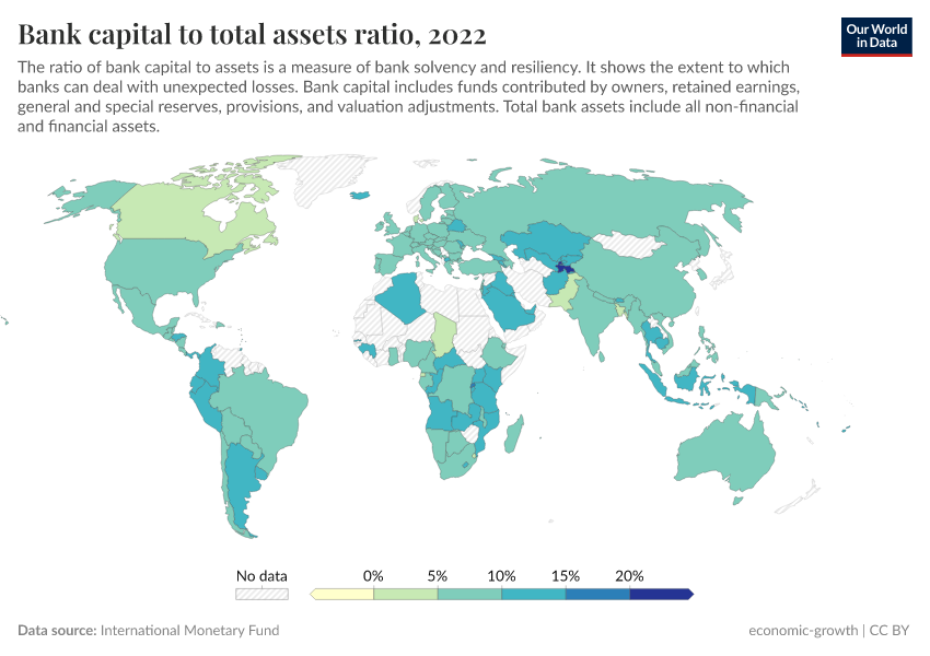 International Monetary Fund – processed by Our World in Data. “Bank capital to total assets ratio” [dataset]. International Monetary Fund, “International Monetary Fund, Financial Soundness Indicators.” [original data]. Retrieved September 5, 2025 from https://data-auxiliary-trade.owid.pages.dev/grapher/bank-capital-to-total-assets-ratio