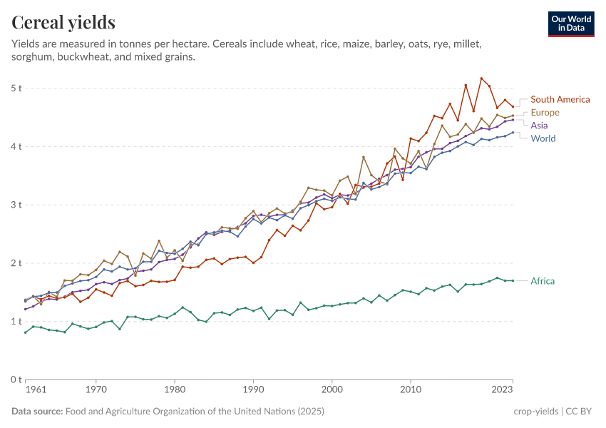 Food and Agriculture Organization of the United Nations (2025) – with major processing by Our World in Data. “Cereal yields – UN FAO” [dataset]. Food and Agriculture Organization of the United Nations, “Production: Crops and livestock products” [original data]. Retrieved September 5, 2025 from https://data-auxiliary-trade.owid.pages.dev/grapher/cereal-yield
