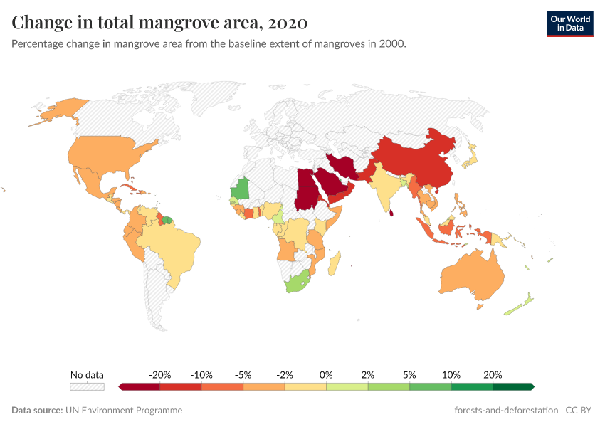 “Data Page: Change in total mangrove area”. Our World in Data (2025). Data adapted from UN Environment Programme. Retrieved from https://data-auxiliary-trade.owid.pages.dev/grapher/change-in-total-mangrove-area [online resource]How to cite this data