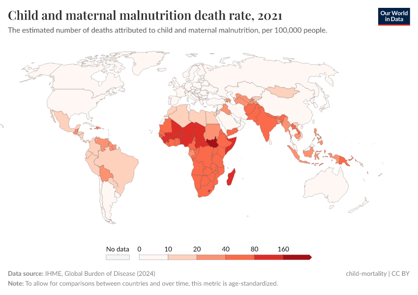 IHME, Global Burden of Disease (2024) – with minor processing by Our World in Data. “Child and maternal malnutrition death rate” [dataset]. IHME, Global Burden of Disease, “Global Burden of Disease - Risk Factors” [original data]. Retrieved September 5, 2025 from https://data-auxiliary-trade.owid.pages.dev/grapher/child-and-maternal-malnutrition-death-rate