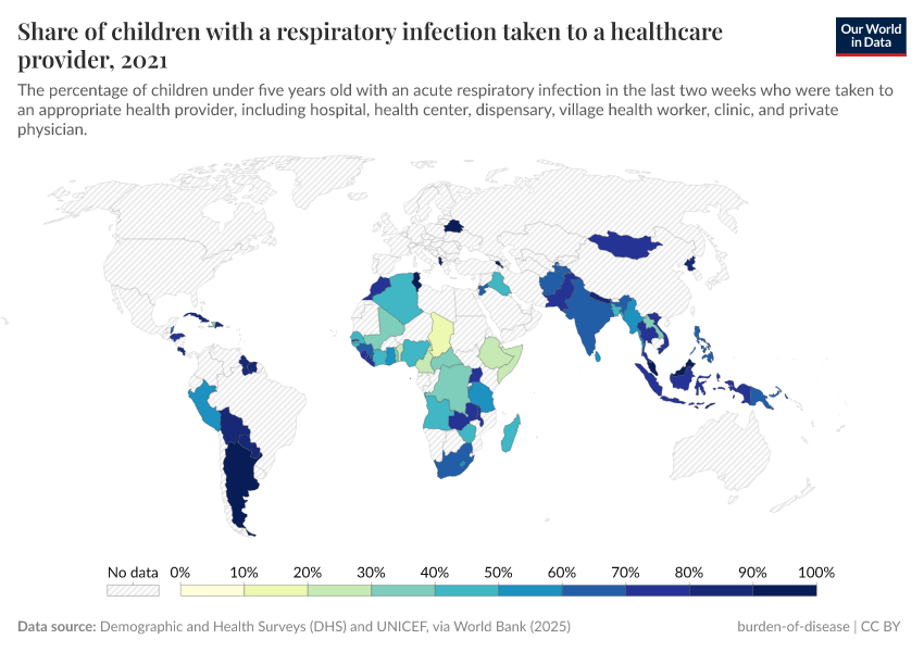 “Data Page: Share of children with a respiratory infection taken to a healthcare provider ”. Our World in Data (2025). Data adapted from Demographic and Health Surveys (DHS) and UNICEF, via World Bank. Retrieved from https://data-auxiliary-trade.owid.pages.dev/grapher/children-treated-ari [online resource]How to cite this data