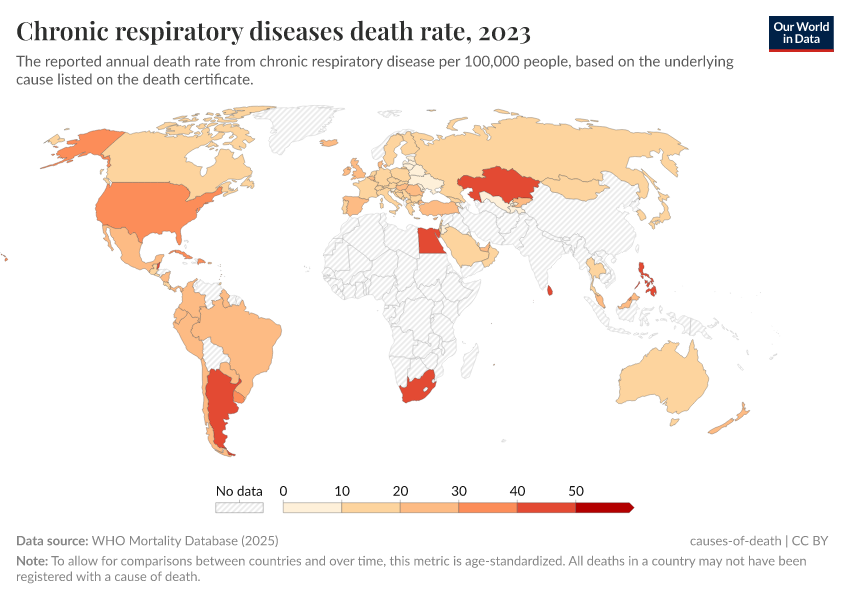 “Data Page: Chronic respiratory diseases death rate”, part of the following publication: Saloni Dattani, Fiona Spooner, Hannah Ritchie, and Max Roser (2023) - “Causes of Death”. Data adapted from WHO Mortality Database. Retrieved from https://data-auxiliary-trade.owid.pages.dev/grapher/chronic-respiratory-diseases-death-rate-who-mdb [online resource]How to cite this data