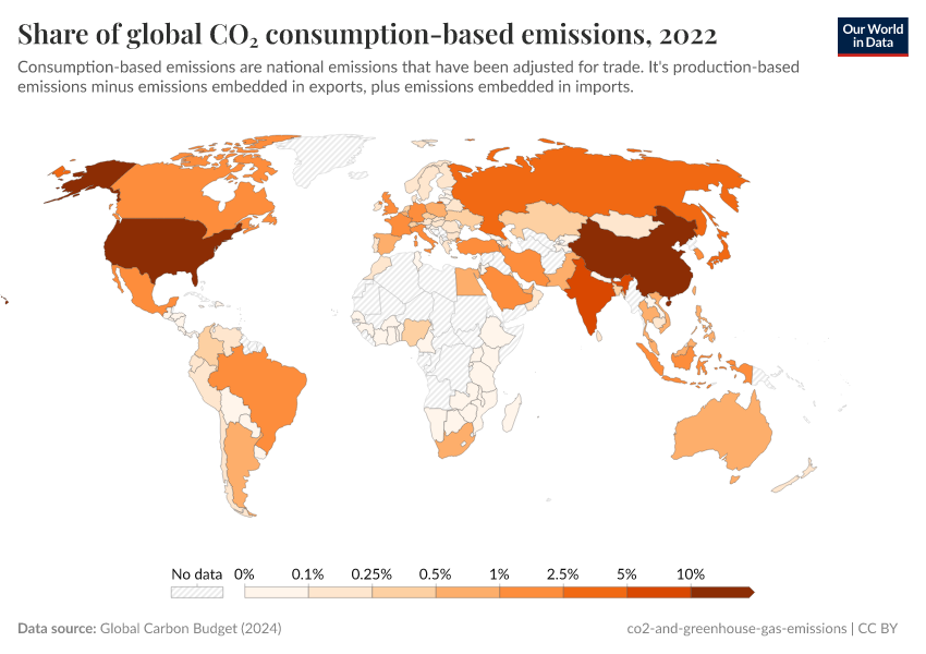 “Data Page: Share of global CO₂ consumption-based emissions”, part of the following publication: Hannah Ritchie, Pablo Rosado, and Max Roser (2023) - “CO₂ and Greenhouse Gas Emissions”. Data adapted from Global Carbon Project. Retrieved from https://data-auxiliary-trade.owid.pages.dev/grapher/co2-consumption-share [online resource]How to cite this data