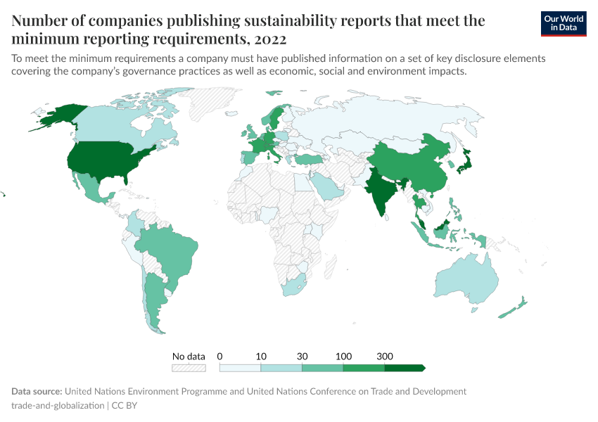 “Data Page: Number of companies publishing sustainability reports that meet the minimum reporting requirements”. Our World in Data (2025). Data adapted from United Nations Environment Programme and United Nations Conference on Trade and Development. Retrieved from https://data-auxiliary-trade.owid.pages.dev/grapher/companies-publishing-sustainability-reports-minimum-requirements [online resource]How to cite this data