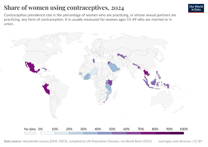 “Data Page: Share of women using contraceptives”. Our World in Data (2025). Data adapted from Demographic and Health Surveys (DHS), Multiple Indicator Cluster Surveys (MICS), and United Nations Population Division, via World Bank. Retrieved from https://data-auxiliary-trade.owid.pages.dev/grapher/contraceptive-prevalence-any-methods-of-women-ages-15-49 [online resource]How to cite this data