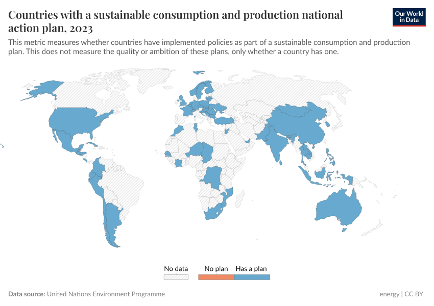 “Data Page: Countries with a sustainable consumption and production national action plan”. Our World in Data (2025). Data adapted from United Nations Environment Programme. Retrieved from https://data-auxiliary-trade.owid.pages.dev/grapher/country-scp-plan [online resource]How to cite this data