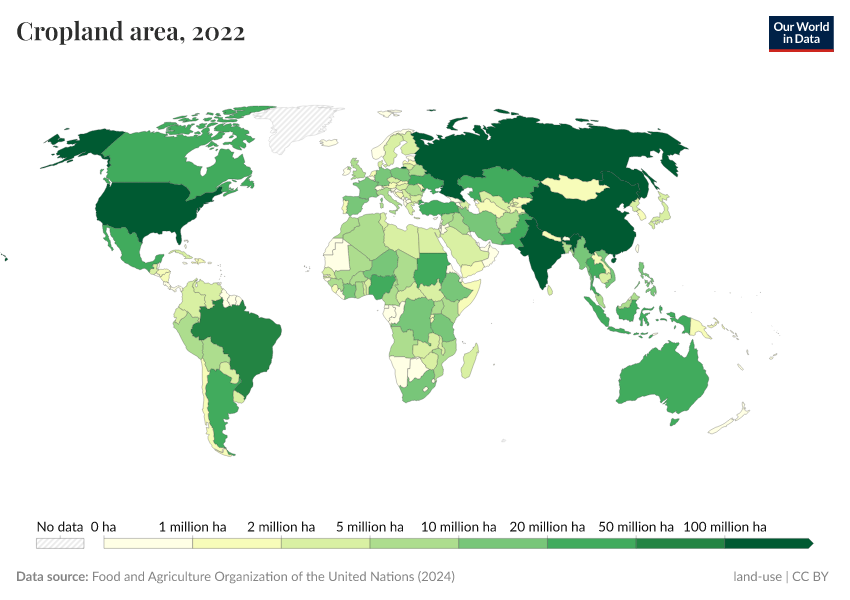 “Data Page: Cropland area”, part of the following publication: Hannah Ritchie, Pablo Rosado, and Max Roser (2023) - “Agricultural Production”. Data adapted from Food and Agriculture Organization of the United Nations. Retrieved from https://data-auxiliary-trade.owid.pages.dev/grapher/cropland-area [online resource]How to cite this data