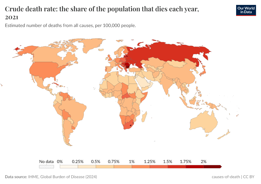 IHME, Global Burden of Disease (2024) – with minor processing by Our World in Data. “Crude death rate: the share of the population that dies each year” [dataset]. IHME, Global Burden of Disease, “Global Burden of Disease - Deaths and DALYs” [original data]. Retrieved September 5, 2025 from https://data-auxiliary-trade.owid.pages.dev/grapher/crude-death-rate-the-share-of-the-population-that-dies-each-year-gbd
