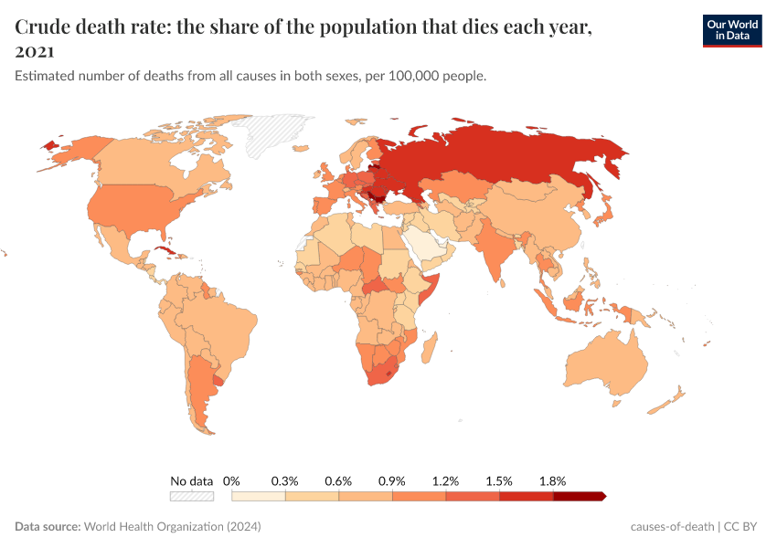 World Health Organization (2024) – with major processing by Our World in Data. “Crude death rate: the share of the population that dies each year” [dataset]. World Health Organization, “Global Health Estimates” [original data]. Retrieved September 5, 2025 from https://data-auxiliary-trade.owid.pages.dev/grapher/crude-death-rate-the-share-of-the-population-that-dies-each-year-who