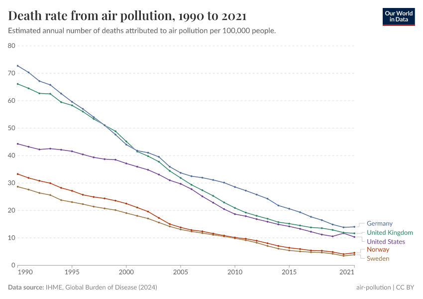 IHME, Global Burden of Disease (2024) – with minor processing by Our World in Data. “Death rate from air pollution” [dataset]. IHME, Global Burden of Disease, “Global Burden of Disease - Risk Factors” [original data]. Retrieved September 5, 2025 from https://data-auxiliary-trade.owid.pages.dev/grapher/death-rate-from-air-pollution-per-100000