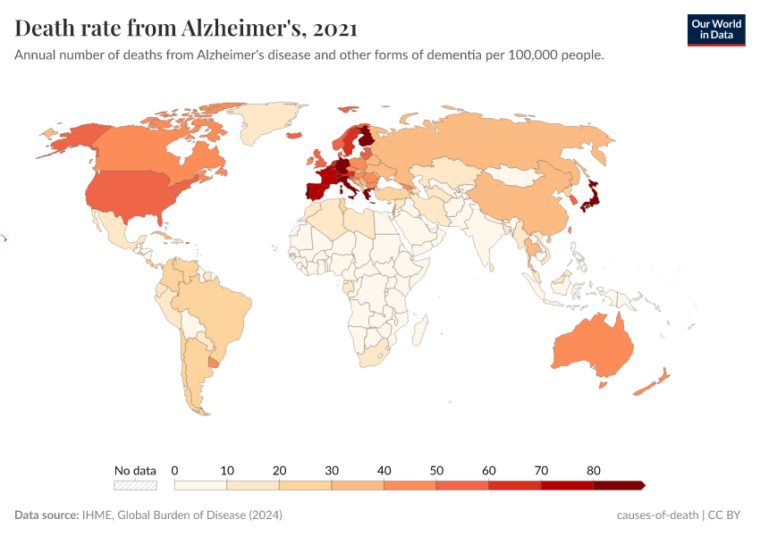 IHME, Global Burden of Disease (2024) – with minor processing by Our World in Data. “Death rate from Alzheimer's” [dataset]. IHME, Global Burden of Disease, “Global Burden of Disease - Deaths and DALYs” [original data]. Retrieved September 5, 2025 from https://data-auxiliary-trade.owid.pages.dev/grapher/death-rate-from-alzheimers-other-dementias-gbd