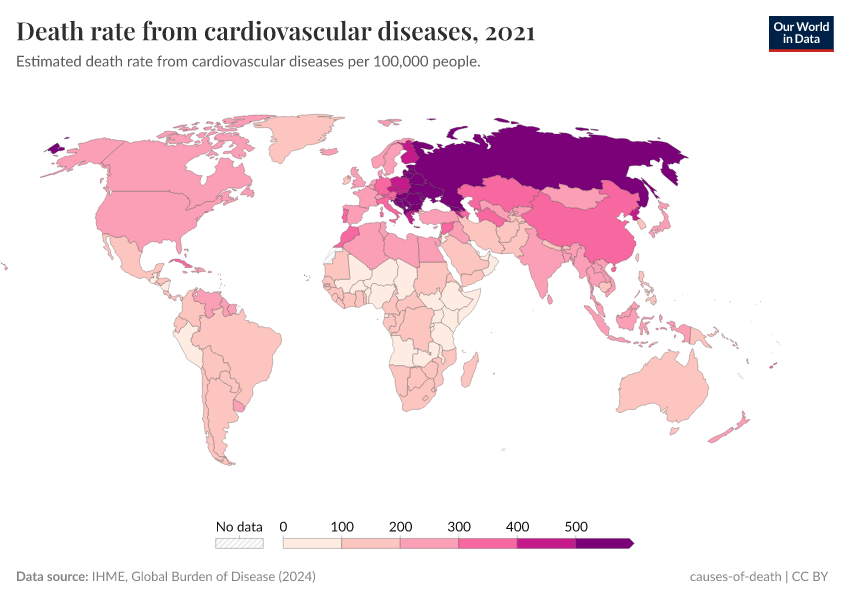 IHME, Global Burden of Disease (2024) – with minor processing by Our World in Data. “Death rate from cardiovascular diseases” [dataset]. IHME, Global Burden of Disease, “Global Burden of Disease - Deaths and DALYs” [original data]. Retrieved September 5, 2025 from https://data-auxiliary-trade.owid.pages.dev/grapher/death-rate-from-cardiovascular-diseases