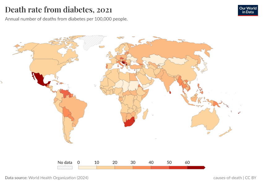 World Health Organization (2024) – with major processing by Our World in Data. “Death rate from diabetes” [dataset]. World Health Organization, “Global Health Estimates” [original data]. Retrieved September 5, 2025 from https://data-auxiliary-trade.owid.pages.dev/grapher/death-rate-from-diabetes-ghe