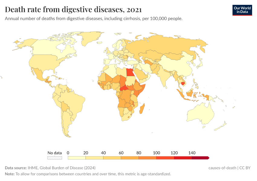 IHME, Global Burden of Disease (2024) – with minor processing by Our World in Data. “Death rate from digestive diseases” [dataset]. IHME, Global Burden of Disease, “Global Burden of Disease - Deaths and DALYs” [original data]. Retrieved September 5, 2025 from https://data-auxiliary-trade.owid.pages.dev/grapher/death-rate-from-digestive-diseases