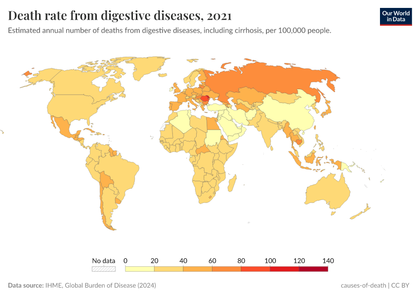 IHME, Global Burden of Disease (2024) – with minor processing by Our World in Data. “Death rate from digestive diseases” [dataset]. IHME, Global Burden of Disease, “Global Burden of Disease - Deaths and DALYs” [original data]. Retrieved September 5, 2025 from https://data-auxiliary-trade.owid.pages.dev/grapher/death-rate-from-digestive-diseases-gbd