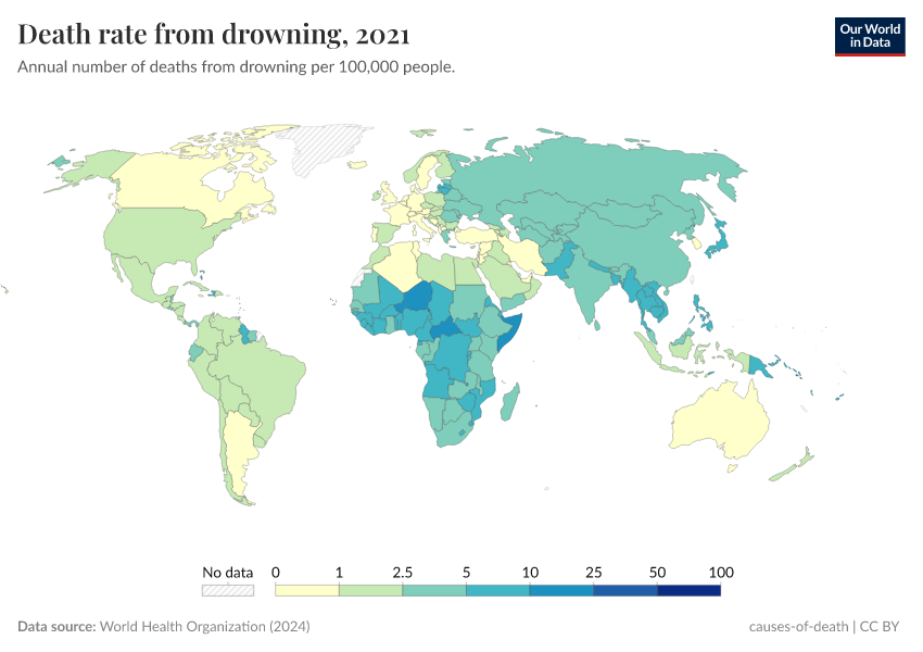 World Health Organization (2024) – with major processing by Our World in Data. “Death rate from drowning” [dataset]. World Health Organization, “Global Health Estimates” [original data]. Retrieved September 5, 2025 from https://data-auxiliary-trade.owid.pages.dev/grapher/death-rate-from-drowning-ghe