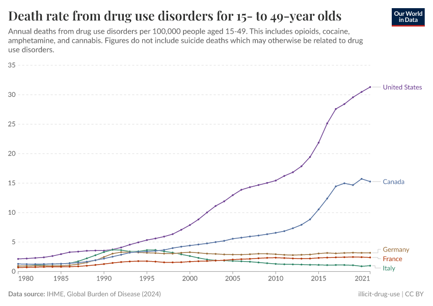 IHME, Global Burden of Disease (2024) – with minor processing by Our World in Data. “Death rate from drug use disorders for 15- to 49-year olds” [dataset]. IHME, Global Burden of Disease, “Global Burden of Disease - Deaths and DALYs” [original data]. Retrieved September 5, 2025 from https://data-auxiliary-trade.owid.pages.dev/grapher/death-rate-from-drug-use-disorders-for-15--to-49-year-olds
