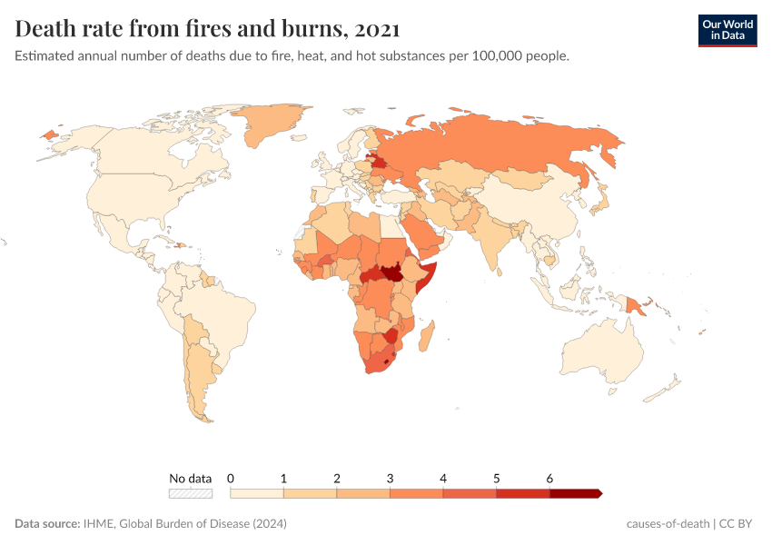 IHME, Global Burden of Disease (2024) – with minor processing by Our World in Data. “Death rate from fires and burns” [dataset]. IHME, Global Burden of Disease, “Global Burden of Disease - Deaths and DALYs” [original data]. Retrieved September 5, 2025 from https://data-auxiliary-trade.owid.pages.dev/grapher/death-rate-from-fires-and-burns-ihme