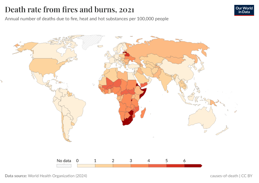 World Health Organization (2024) – with major processing by Our World in Data. “Death rate from fires and burns” [dataset]. World Health Organization, “Global Health Estimates” [original data]. Retrieved September 5, 2025 from https://data-auxiliary-trade.owid.pages.dev/grapher/death-rate-from-fires-and-burns-who