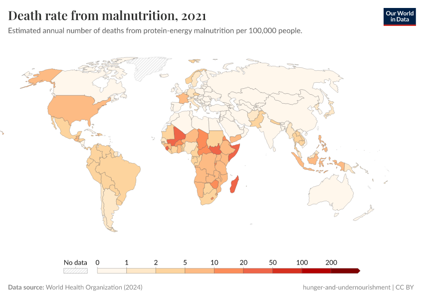 World Health Organization (2024) – with major processing by Our World in Data. “Death rate from malnutrition” [dataset]. World Health Organization, “Global Health Estimates” [original data]. Retrieved September 5, 2025 from https://data-auxiliary-trade.owid.pages.dev/grapher/death-rate-from-malnutrition-ghe