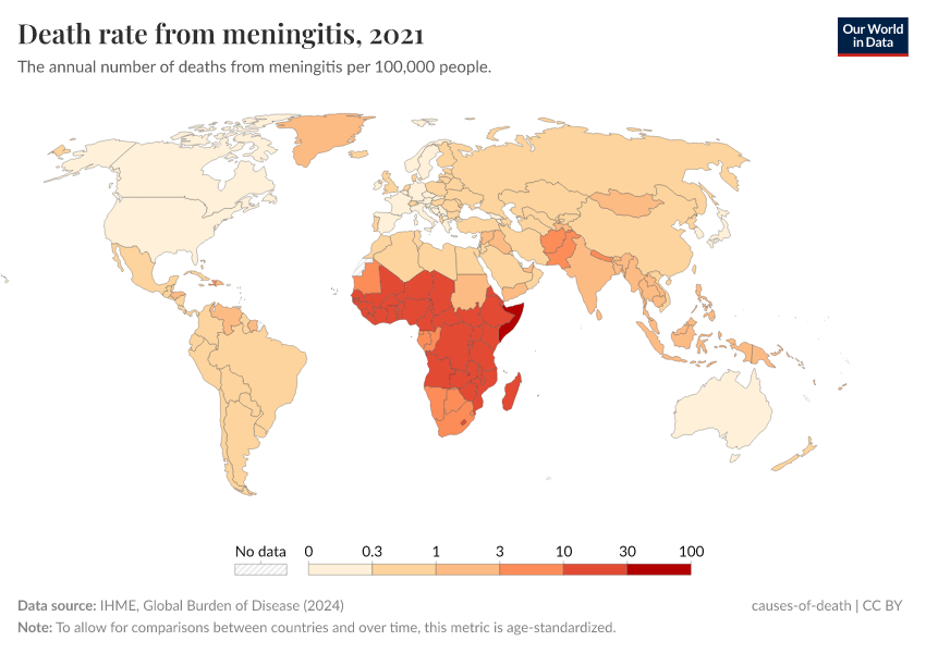 IHME, Global Burden of Disease (2024) – with minor processing by Our World in Data. “Death rate from meningitis” [dataset]. IHME, Global Burden of Disease, “Global Burden of Disease - Deaths and DALYs” [original data]. Retrieved September 5, 2025 from https://data-auxiliary-trade.owid.pages.dev/grapher/death-rate-from-meningitis