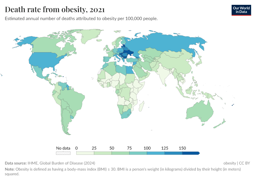 IHME, Global Burden of Disease (2024) – with minor processing by Our World in Data. “Death rate from obesity” [dataset]. IHME, Global Burden of Disease, “Global Burden of Disease - Risk Factors” [original data]. Retrieved September 5, 2025 from https://data-auxiliary-trade.owid.pages.dev/grapher/death-rate-from-obesity-gbd