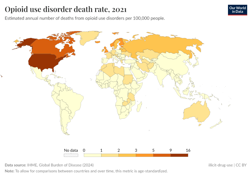 IHME, Global Burden of Disease (2024) – with minor processing by Our World in Data. “Opioid use disorder death rate” [dataset]. IHME, Global Burden of Disease, “Global Burden of Disease - Deaths and DALYs” [original data]. Retrieved September 5, 2025 from https://data-auxiliary-trade.owid.pages.dev/grapher/death-rate-from-opioid-use