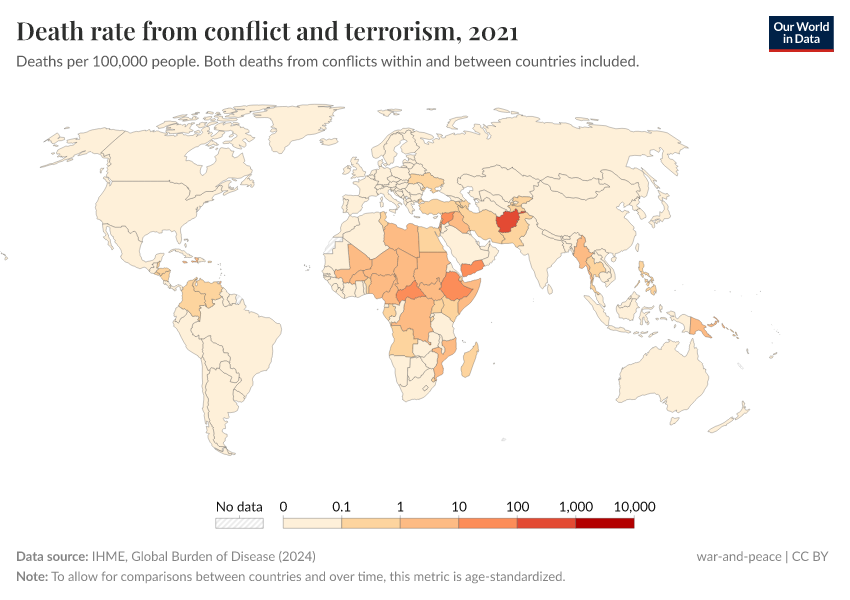 IHME, Global Burden of Disease (2024) – with minor processing by Our World in Data. “Death rate from conflict and terrorism” [dataset]. IHME, Global Burden of Disease, “Global Burden of Disease - Deaths and DALYs” [original data]. Retrieved September 5, 2025 from https://data-auxiliary-trade.owid.pages.dev/grapher/death-rates-from-conflict-and-terrorism-gbd