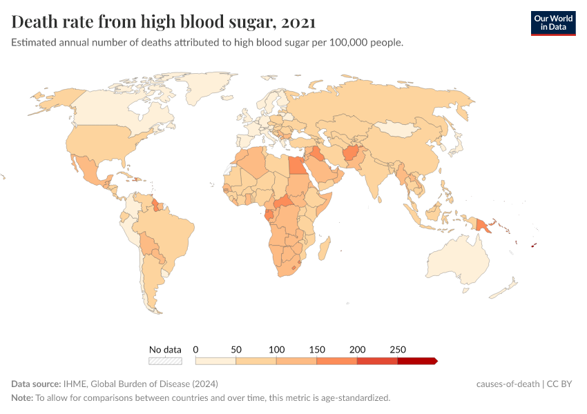 IHME, Global Burden of Disease (2024) – with minor processing by Our World in Data. “Death rate from high blood sugar” [dataset]. IHME, Global Burden of Disease, “Global Burden of Disease - Risk Factors” [original data]. Retrieved September 5, 2025 from https://data-auxiliary-trade.owid.pages.dev/grapher/death-rates-from-high-blood-sugar