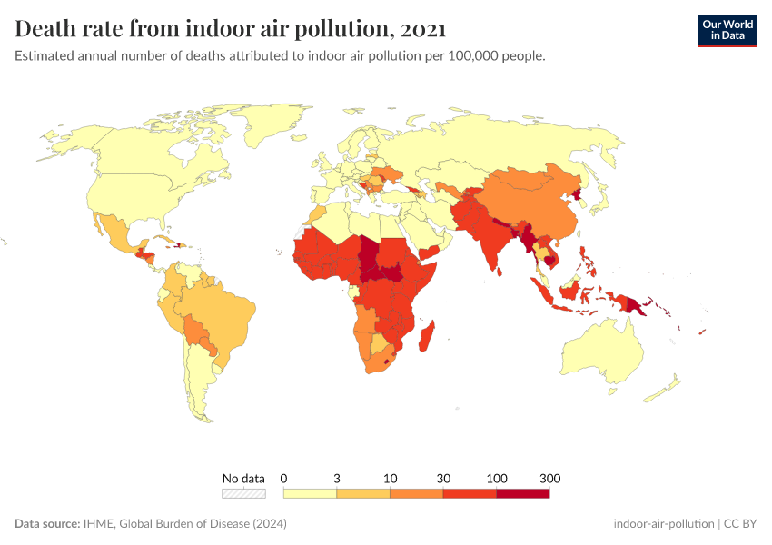 IHME, Global Burden of Disease (2024) – with minor processing by Our World in Data. “Death rate from indoor air pollution” [dataset]. IHME, Global Burden of Disease, “Global Burden of Disease - Risk Factors” [original data]. Retrieved September 5, 2025 from https://data-auxiliary-trade.owid.pages.dev/grapher/death-rates-from-indoor-air-pollution-gbd
