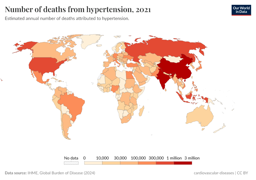 IHME, Global Burden of Disease (2024) – with minor processing by Our World in Data. “Number of deaths from hypertension” [dataset]. IHME, Global Burden of Disease, “Global Burden of Disease - Risk Factors” [original data]. Retrieved September 5, 2025 from https://data-auxiliary-trade.owid.pages.dev/grapher/deaths-due-to-high-blood-pressure