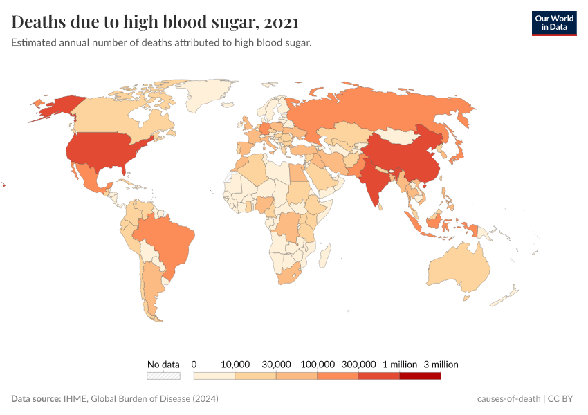 IHME, Global Burden of Disease (2024) – with minor processing by Our World in Data. “Deaths due to high blood sugar” [dataset]. IHME, Global Burden of Disease, “Global Burden of Disease - Risk Factors” [original data]. Retrieved September 5, 2025 from https://data-auxiliary-trade.owid.pages.dev/grapher/deaths-due-to-high-blood-sugar