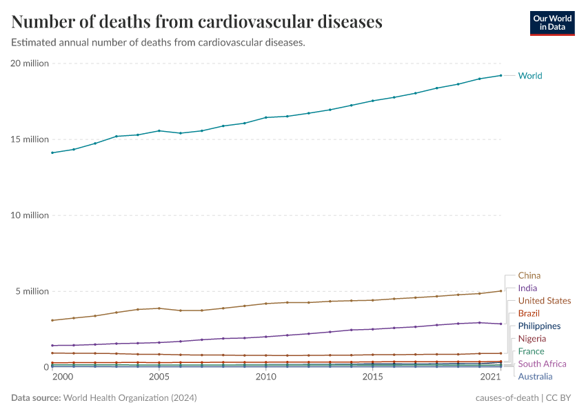 World Health Organization (2024) – with major processing by Our World in Data. “Number of deaths from cardiovascular diseases” [dataset]. World Health Organization, “Global Health Estimates” [original data]. Retrieved September 5, 2025 from https://data-auxiliary-trade.owid.pages.dev/grapher/deaths-from-cardiovascular-disease-ghe