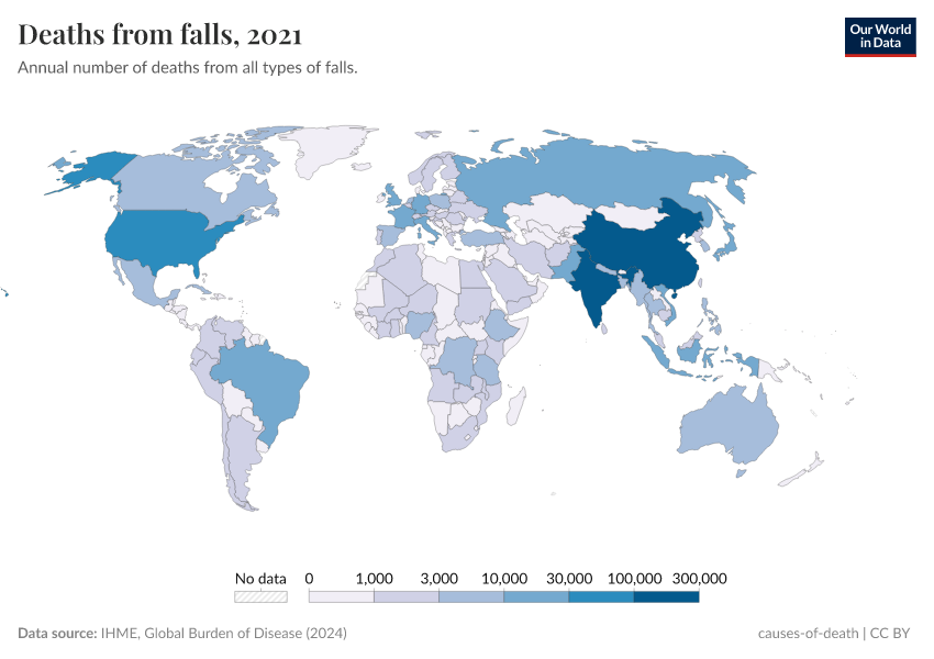 “Data Page: Deaths from falls”, part of the following publication: Esteban Ortiz-Ospina and Max Roser (2016) - “Global Health”. Data adapted from IHME, Global Burden of Disease. Retrieved from https://data-auxiliary-trade.owid.pages.dev/grapher/deaths-from-falls-gbd [online resource]How to cite this data