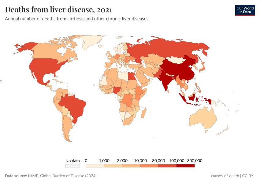 IHME, Global Burden of Disease (2024) – with minor processing by Our World in Data. “Deaths from liver disease” [dataset]. IHME, Global Burden of Disease, “Global Burden of Disease - Deaths and DALYs” [original data]. Retrieved September 5, 2025 from https://data-auxiliary-trade.owid.pages.dev/grapher/deaths-from-liver-disease