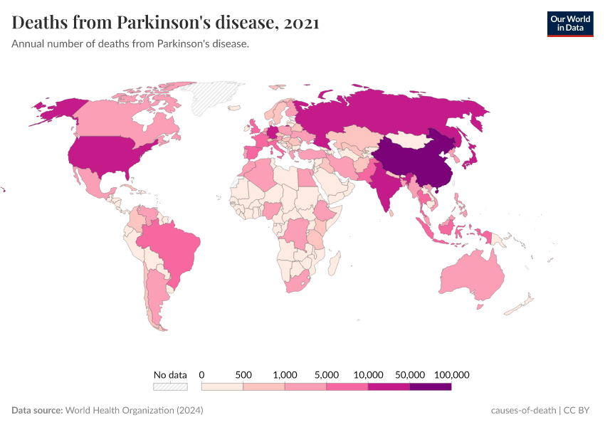World Health Organization (2024) – with major processing by Our World in Data. “Deaths from Parkinson's disease” [dataset]. World Health Organization, “Global Health Estimates” [original data]. Retrieved September 5, 2025 from https://data-auxiliary-trade.owid.pages.dev/grapher/deaths-from-parkinsons-disease-ghe