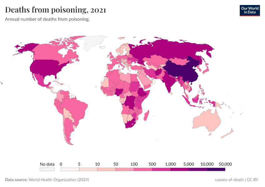 World Health Organization (2024) – with major processing by Our World in Data. “Deaths from poisoning” [dataset]. World Health Organization, “Global Health Estimates” [original data]. Retrieved September 5, 2025 from https://data-auxiliary-trade.owid.pages.dev/grapher/deaths-from-poisonings-ghe