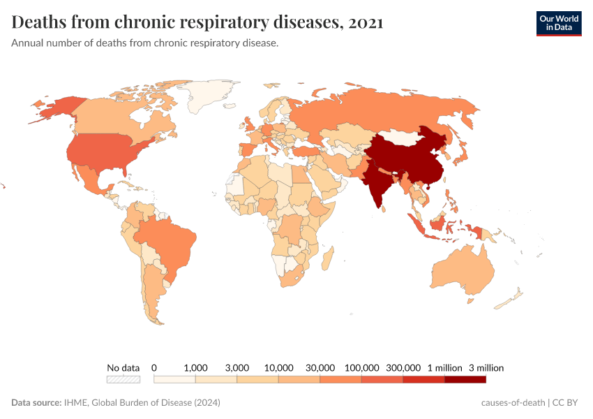 “Data Page: Deaths from chronic respiratory diseases”, part of the following publication: Esteban Ortiz-Ospina and Max Roser (2016) - “Global Health”. Data adapted from IHME, Global Burden of Disease. Retrieved from https://data-auxiliary-trade.owid.pages.dev/grapher/deaths-from-respiratory-disease [online resource]How to cite this data