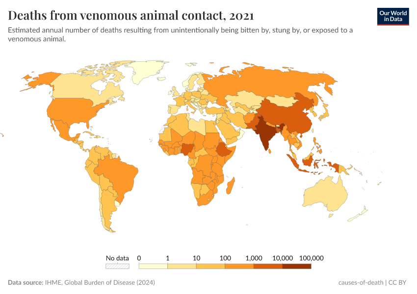 IHME, Global Burden of Disease (2024) – with minor processing by Our World in Data. “Deaths from venomous animal contact” [dataset]. IHME, Global Burden of Disease, “Global Burden of Disease - Deaths and DALYs” [original data]. Retrieved September 5, 2025 from https://data-auxiliary-trade.owid.pages.dev/grapher/deaths-from-venomous-animal-contact