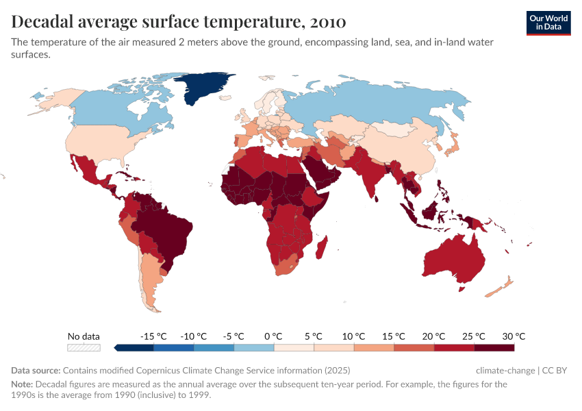 “Data Page: Decadal average surface temperature”, part of the following publication: Hannah Ritchie, Pablo Rosado, and Veronika Samborska (2024) - “Climate Change”. Data adapted from Contains modified Copernicus Climate Change Service information. Retrieved from https://data-auxiliary-trade.owid.pages.dev/grapher/decadal-average-surface-temperature [online resource]How to cite this data
