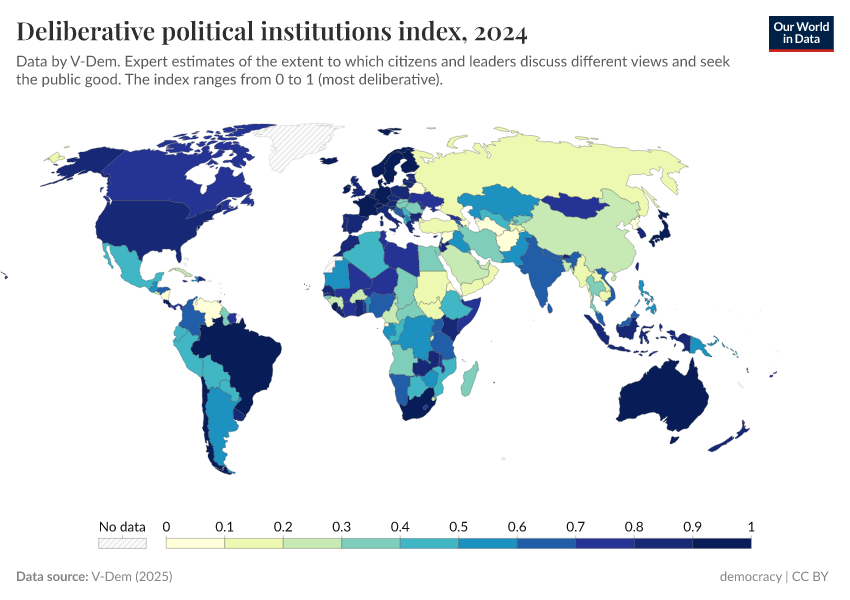 V-Dem (2025) – processed by Our World in Data. “Deliberative political institutions index – V-Dem” [dataset]. V-Dem, “Democracy report v15” [original data]. Retrieved September 5, 2025 from https://data-auxiliary-trade.owid.pages.dev/grapher/deliberative-political-institutions-index